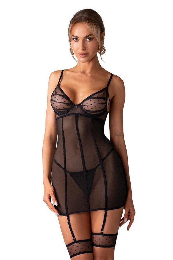 Acest babydoll scurt si mulat pune in valoare fiecare curba intr-un mod seducator si rafinat. Realizat din tulle uni in combinatie cu tulle delicat cu buline, creeaza un joc jucaus de transparente, in timp ce decupajul din spate adauga un strop de indrazneala. Cupele sunt prevazute cu armatura metalica pentru forma si suport, iar bretelele si portjartierele reglabile asigura o potrivire impecabila. Materialul usor mangaie pielea, iar mica bijuterie ornamentala dintre cupe aduce un accent elegant. Rezultatul este un babydoll care combina senzualitatea cu feminitatea intr-o forma moderna, fiind perfect pentru seri in care eleganta se intalneste cu dorinta.