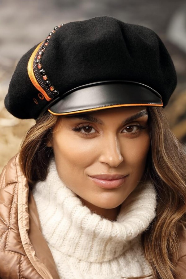 Caciula de dama tip bereta eleganta cu cozoroc WL11382 este un accesoriu sofisticat care completeaza garderobele creionate in jurul bunului gust. Se distinge prin design complex, accesorizare sofisticata si calitate premium. Cozorocul inteligent introdus ofera un aer misterios celei ce o poarta. In lateral este decorata cu banda decorativa, capse, strasuri si cristale ce imprima un aer pretios.