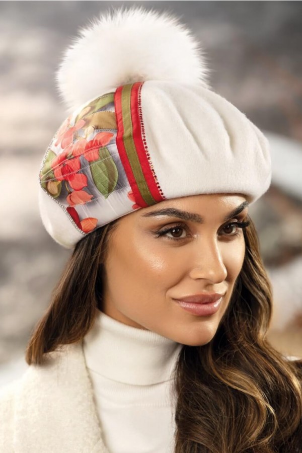 Caciula de dama tip bereta cu pompon din blanita WL11383 este accesoriul vestimentar indraznet care iti permite sa fii feminina si delicata cu orice ocazie. Are design cochet accentuat prin accesorizarea cu imprimeu floral completat cu banda decorativa si strasuri. Piesa de rezistenta este pomponul supradimensionat din blanita naturala. Acesta este detasabil pentru a face curatarea mai usoara si mai sigura.