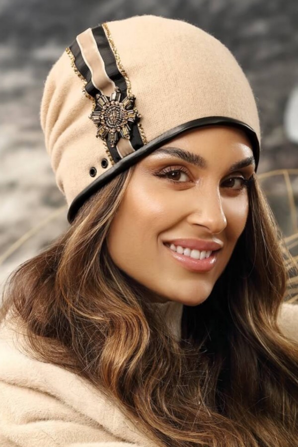 Caciula eleganta de dama WL11332 este un model cochet cu aspect premium. Se remarca datorita calitatii exceptionale, aspectului premium si accesorizarii chic. In lateral este decorata cu banda decorativa in doua culori, capse, strasuri ce stralucesc in razele de lumina si margele. Modelul are design modern dat de pliurile prinse la spate. Marginea este finisata cu piele ecologica si ascunde un snur care permite intr-o mica masura ajustarea.