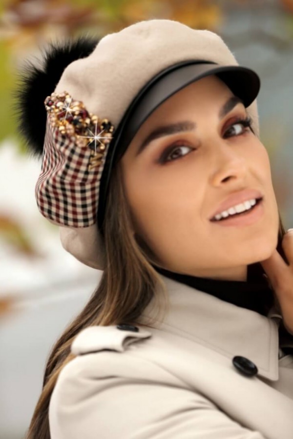 Caciula de dama stil bereta cu cozoroc si pompon.