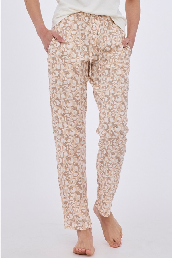 Pantalon de pijama pentru femei realizat din bumbac de inalta calitate. Pantalonul este lung, are talie elastica confortabila a carei circumferinta se poate ajusta cu ajutorul unui siret, prezinta model deosebit si este prevazut cu buzunare la nivelul soldurilor.