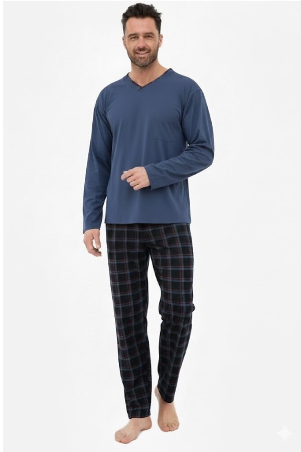Pijama pentru barbati realizata din bumbac de inalta calitate, compusa din 2 piese. Bluza are maneca lunga, decolteu in V finisat cu panglica ornamentala ingusta in nuanta pantalonului si este prevazuta cu un buzunar la nivelul pieptului, iar pantalonul este lung, prezinta model deosebit cu carouri si are talie elastica confortabila.