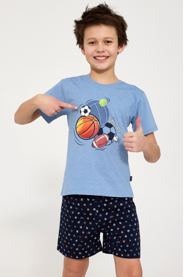 Pijama pentru baieti realizata din bumbac de inalta calitate. Pijamaua este compusa din 2 piese. Bluza este confectionata din tesatura melanj, are maneca scurta, decolteu rotund si este infrumusetata pe partea frontala cu mingi folosite in diverse sporturi, iar pantalonul este scurt, are talie elastica confortabila si prezinta model deosebit cu tematica sportiva.