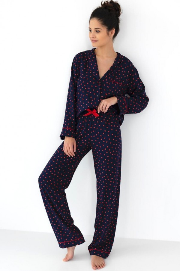 Pijama de dama realizata din vascoza de inalta calitate. Pijamaua este compusa din 2 piese si prezinta model deosebit cu inimioare. Bluza are maneca lunga finisata cu manseta larga, decolteu in V finisat cu guler, se inchide pe partea frontala cu nasturi si este prevazuta in zona bustului cu un buzunar pus in evidenta de o panglica ornamentala subtire (precum cele ce impodobesc mansetele si partea inferioara a pantalonului), iar pantalonul este lung si are talie elastica confortabila decorata cu o fundita cocheta in nuanta contrastanta. O alegere ideala pentru un somn odihnitor si un start bun al zilei cu prima cafea de dimineata.