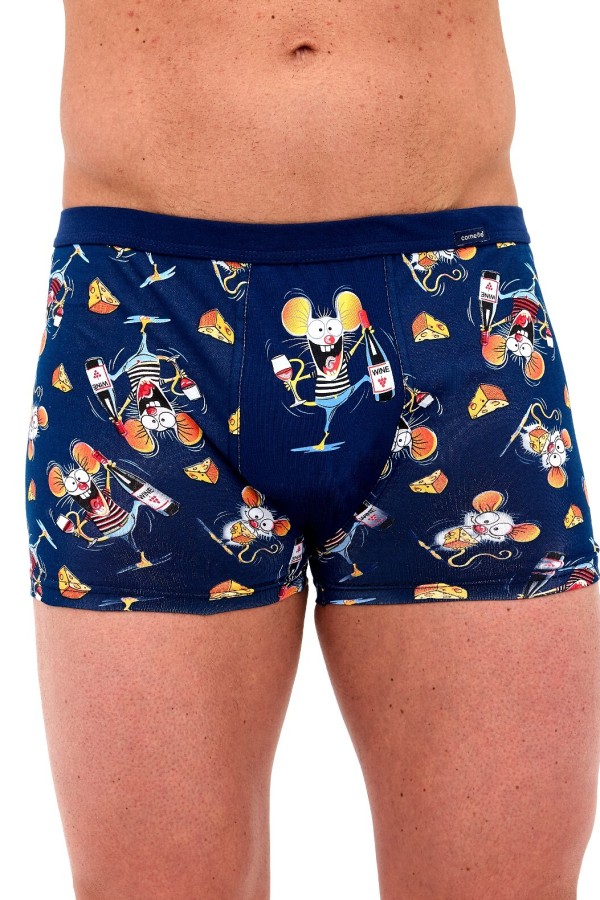 Boxeri pentru barbati din gama "Tattoo", extrem de confortabili, realizati din bumbac de inalta calitate si elastan, conceputi pentru barbatii care pretuiesc confortul si comoditatea. Boxerii au talie elastica confortabila, prezinta model amuzant cu un soricel care se bucura de o sticla de vin si de cascaval si sunt infrumusetati pe partea frontala cu un imprimeu colorat cu un soricel mai mare gata de distractie. O propunere excelenta pentru a face un cadou plin de personalitate si stil barbatului iubit.