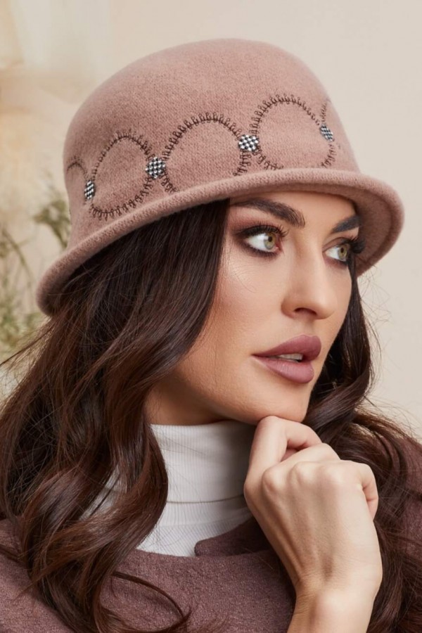Caciula de dama stil palarie Amara 3 este o piesa care se remarca prin designul minimalist si accentele puternice. Modelul este inedit, avand ca si accesorizare o serie de cercuri realizate prin cusaturi decorative, unite cu ajutorul unor strasuri asortate ce capteaza razele de lumina si ofera o stralucire subtila. Este usor de integrat in tinutele clasice si poate fi purtata cu aceeasi eleganta atat de tinerele cosmopolite, cat si de femeile mature care apreciaza bunul gust si detaliile sofisticate.