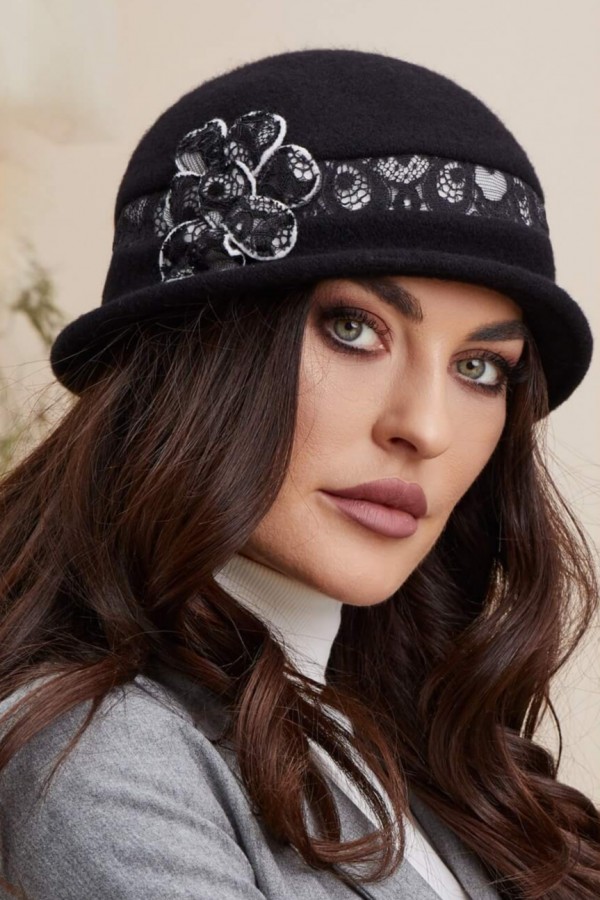 Caciula de dama stil palarie Patricia are un bor mic care incadreaza frumos trasaturile faciale. Piesa este accesorizata cu o banda din dantela eleganta care inconjoara calota, oferind un plus de rafinament si unicitate. In lateral este decorata cu o aplicatie florala fina care atrage privirile si completeaza perfect ansamblul. Acest model asigura confort si protectie in zilele reci de toamna-iarna.