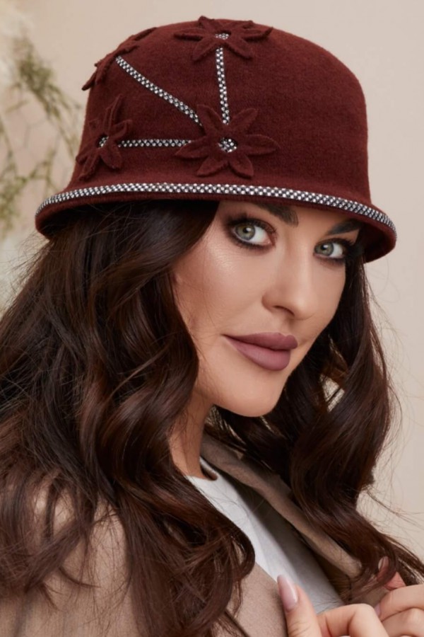 Caciula de dama stil palarie Dora 1 este cu adevarat o piesa deosebita, care impresioneaza prin eleganta. Cu marginea borului decorata cu o bogata aplicatie de strasuri, aceasta piesa atrage privirile si adauga un strop de glam intr-un mod subtil. Nu doar marginea borului este decorata cu strasuri, ci si partea laterala a caciulii este accesorizata cu aplicatii florale si mici strasuri, care irizeaza in lumina si adauga o nota de feminitate si delicatete. Toate aceste accesorii sunt atent aplicate, astfel incat sa nu compromita calitatea si frumusetea naturala a materialului.