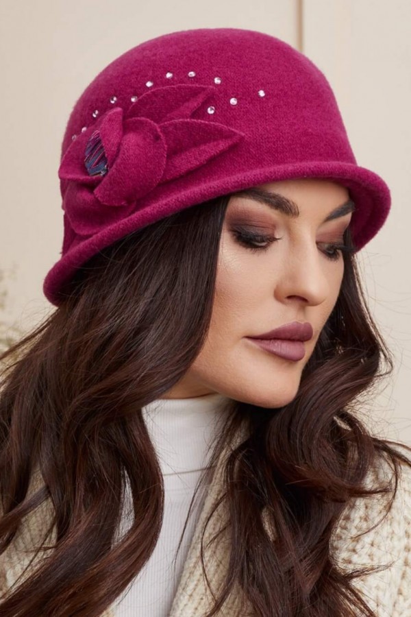 Modelul este decorat in lateral cu o aplicatie florala, care ofera un aer proaspat si delicat. Aceasta este completata cu strasuri ce stralucesc discret in lumina, astfel incat sa atraga privirile si sa aduca un plus de eleganta. Finisajele de calitate si designul modern transforma aceasta caciula intr-un adevarat statement piece. Realizata din lana de cea mai buna calitate, aceasta caciula ofera o stare de confort termic ridicata, fiind potrivita pentru sezonul rece. Lana provine de la oile din rasa merinos si se bucura certificare Woolmark. Croiul stil palarie, inspirat din perioada interbelica, pune in valoare trasaturile faciale si accentueaza feminitatea, aducand un plus de stil garderobei.