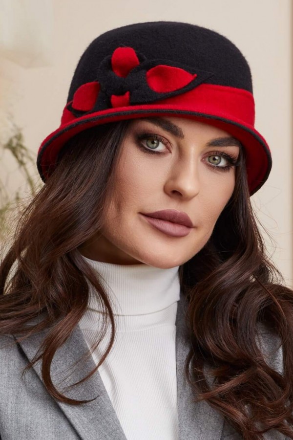 Caciula de dama stil palarie Muna 1 este un accesoriu vestimentar deosebit, care poate adauga un plus de rafinament si stil oricarei tinute. Croiala sa clasica cu bor mic, este una eleganta si pune in valoare trasaturile faciale ale purtatoarei. In plus, este realizata din doua culori, combinand negru si rosu intr-un mod armonios si elegant. Negru, cu tenta sa sobra, adauga un aer misterios si sofisticat, in timp ce rosul adauga un strop de culoare si energie tinutei.