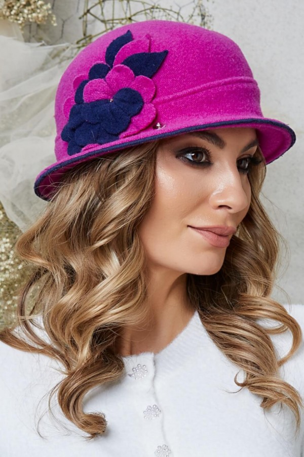 Elementul definitoriu al designului se afla pe partea dreapta: un decor floral intr-o combinatie de fucsia si bleumarin. Acest detaliu, alaturi de placuta rotunda cu initiala Ralenne, aduce un plus de sofisticare si individualitate. Cusatura decorativa care inconjoara calota si borul mic, finisat in nuanta contrastanta de bleumarin, completeaza designul, oferindu-i un finisaj perfect.
