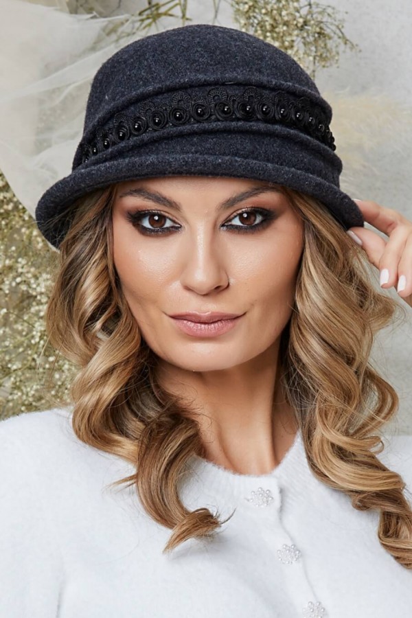Grafitul, o nuanta deosebita, profunda, evoca eleganta sobra, dar plina de personalitate. Cu aceasta nuanta ca fundatie, modelul adauga tinutei tale o nota de distinctie. Este acea culoare care, desi se aseamana cu un gri inchis sau un negru luminat, are adancimea si subtilitatea sa proprie. Dar ce ar fi culoarea fara detalii? Calota, centrul de interes, este delicat inconjurata de o banda din dantela neagra. Acesta dantela nu este doar un simplu accesoriu. Marginile ei fine si margelele asortate adauga o complexitate care transforma caciula de dama stil palarie Sanziana intr-un accesoriu de neuitat. Cele doua pliuri decorative care delimiteaza dantela ofera un plus de textura si volum, adaugand un plus de dimensiune intregului design.