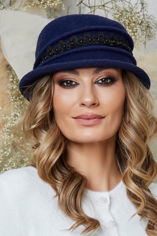 Acum, sa ne gandim la versatilitate. Cu ce se potriveste aceasta caciula stil palarie? Datorita culorii sale bleumarin, se asorteaza perfect cu nuante neutre precum bej, gri sau alb. Este ideala pentru a completa un outfit casual cu jeans si un pulover oversized sau pentru a adauga o nota de eleganta unei rochii simple. De asemenea, se potriveste de minune cu un palton sau cu o jacheta in tonuri intunecate. Margelutele si dantela aduc un strop de sclipire si contrast, ceea ce o face potrivita chiar si pentru evenimente mai formale sau iesiri in oras.