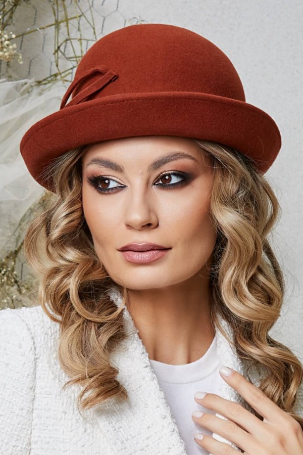 Palarie de dama Anya 4 – baza designului consta in calota rotunda si borul mediu asimetric intors in sus. Funda supradimensionata, stilizata din benzi inguste din fetru, amplasata in partea dreapta, aduce un plus de originalitate si stil. In zona decorului, borul este mai putin intors, creand un echilibru vizual placut si un contrast subtil cu restul designului. Panglica din fetru care mascheaza trecerea de la calota la bor este un exemplu de maiestrie artizanala. Este un detaliu care, la prima vedere, poate parea minor, dar in realitate imbogateste intregul design, oferind o continuitate si o coeziune estetica.