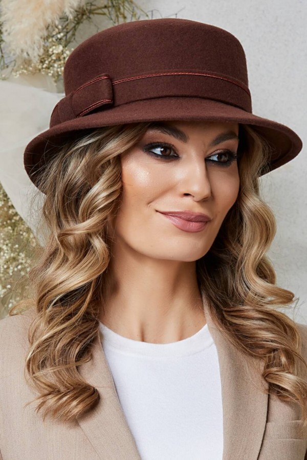 Palarie de dama Chloe 2 – in ceea ce priveste designul, este o adevarata declaratie de stil. Calota are forma cilindrica iar borul mediu si cu marginea usor aplecata in jos, adauga o nota chic. Este o palarie ce se potriveste de minune atat tinutelor casual, cat si celor elegante, oferind un plus de distinctie. Unul dintre detaliile care face aceasta palarie cu adevarat speciala este decorul de la baza calotei. O banda lata din acelasi fetru de inalta calitate imbraca baza palariei, fiind accentuata de o fundita stilizata aplicata cu grija in lateral. Fundita, alaturi de banda, sunt evidentiate prin cusaturi decorative cu aspect satinat ce adauga o nota de rafinament.