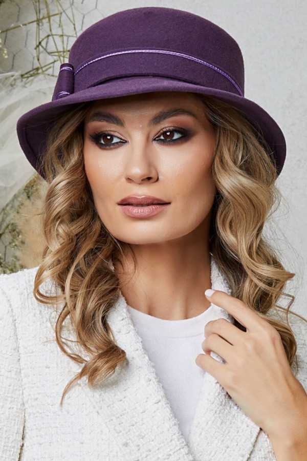 Palarie de dama Chloe 3 – dar ce ar fi aceasta piesa fara detaliile ce o fac cu adevarat unica? La baza calotei, o banda lata din acelasi fetru fin se desfasoara cu gratie, fiind punctata de o fundita stilizata, plasata in lateral. Atat fundita cat si banda sunt puse in valoare de cusaturi decorative mov cu aspect satinat, care adauga un plus de rafinament intregii compozitii. Culoarea violet a palariei aduce o nota vibranta, dar in acelasi timp clasica, tinutelor terne din sezonul rece. Aceasta nuanta bogata si profunda este usor de asortat, fiind potrivita pentru o multitudine de tinute si ocazii. Fie ca este purtata in drum spre locul de munca sau catre un eveniment special, veti atrage privirile admirative ale celor din jur.