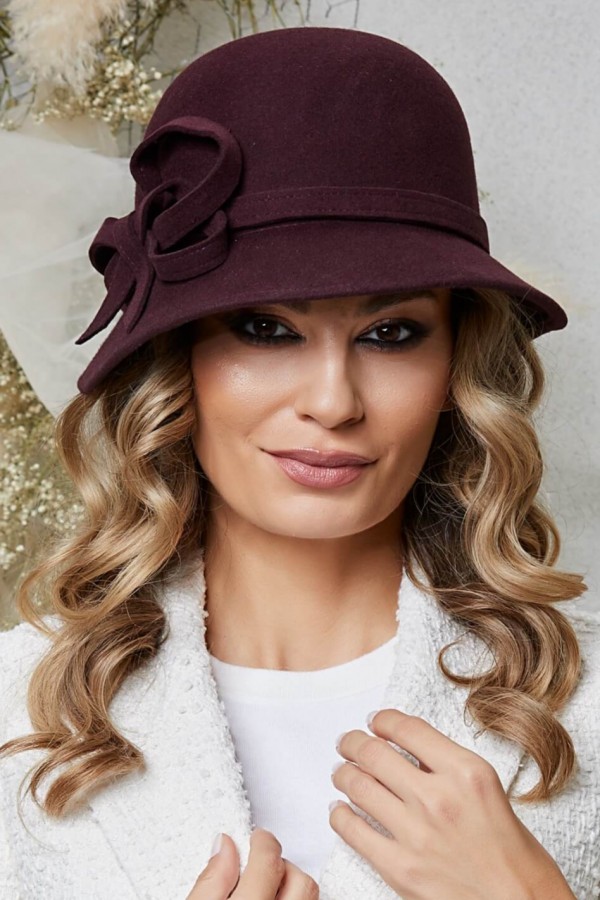 Palarie de dama Elvira 2 – culoarea violet inchis este, de asemenea, o alegere inspirata. Este o nuanta interesanta si rafinata, potrivita pentru doamnele care doresc o alternativa la clasicul negru, fara a compromite eleganta. Piesa este o combinatie perfecta intre retro si modern, functionalitate si estetica. Poate completa cu succes un palton cu linii clasice, un sacou cambrat sau o jacheta eleganta