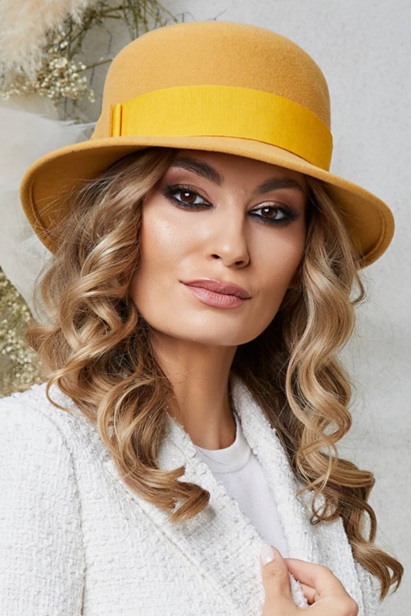 Palarie de dama Janeta 5 – designul sau se bazeaza pe echilibru si rafinament. Banda lata ripsata, care evidentiaza trecerea de la calota la bor, aduce un plus de textura si complexitate vizuala. Aceasta banda functioneaza si ca un element de contrast, amplificand si mai mult culoare galbena a palariei. Un alt detaliu care iese in evidenta este fundita stilizata, confectionata din fetru si banda ripsata. Aceasta este amplasata strategic in lateral, oferind un accent feminin si sofisticat designului.
