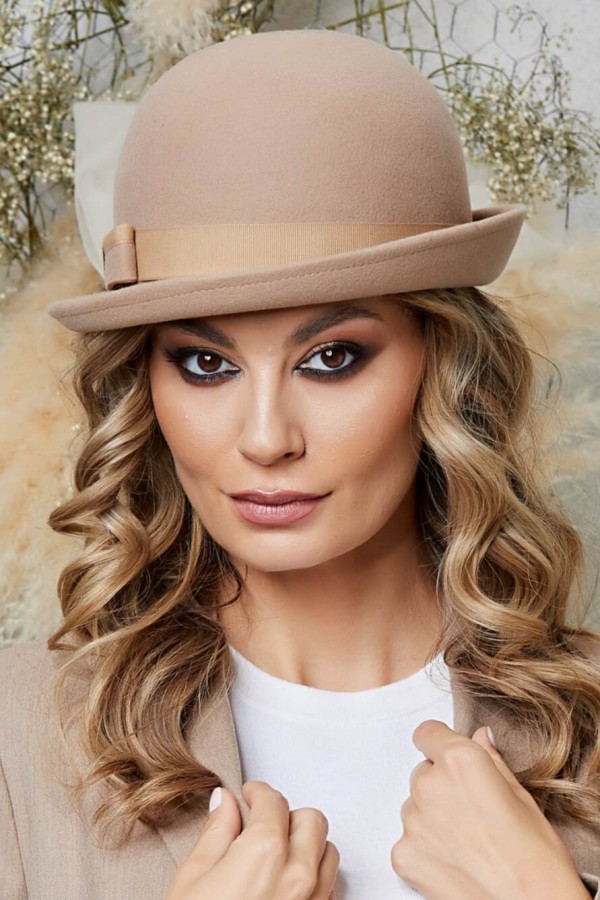Palarie de dama Marga – nu ar fi completa fara detaliile decorative care o fac cu adevarat speciala. La baza calotei, panglica satinata ripsata ofera un contrast subtil cu bejul inchis al palariei. In lateral, o funda din fetru, finisata cu aceeasi panglica ripsata, imprima un aer cochet amplificat de borul ingustat in dreptul fundei. Intregul ansamblu creeaza un echilibru vizual perfect.