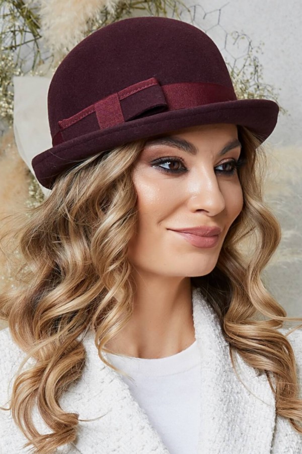 Palarie de dama Marga 3 – fiecare piesa are nevoie de acel “ceva” care sa o faca sa iasa in evidenta. In cazul de fata, acest element este reprezentat de ansamblul decorativ. O panglica satinata ripsata, de culoare asortata, imbraca baza calotei. Iar punctul de atractie este funda laterala din fetru, finisata cu aceeasi panglica ripsata, care ofera un contrapunct textural si un aer feminin.
