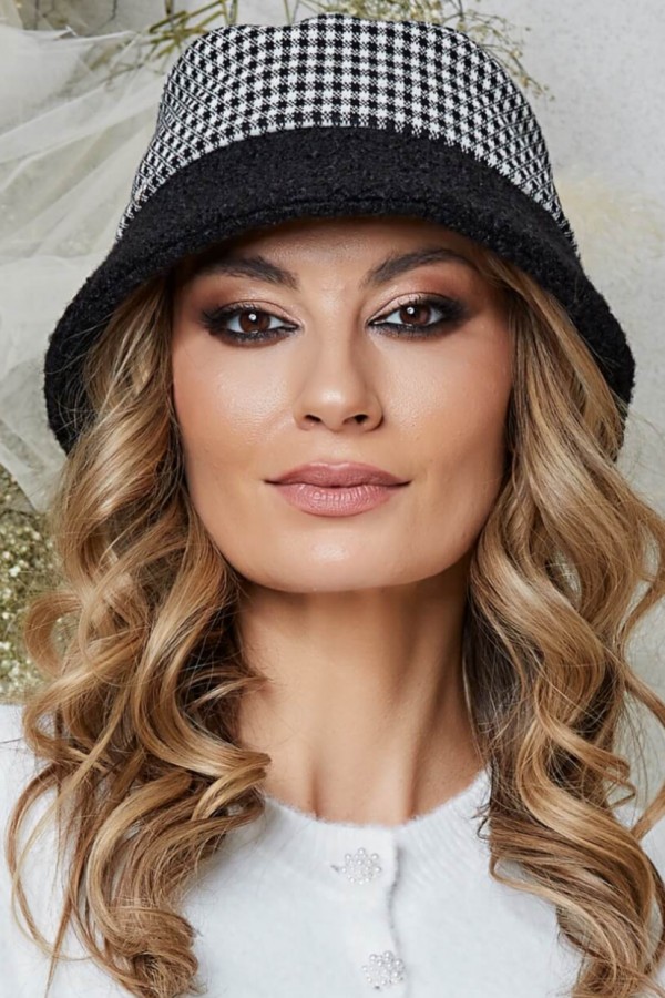 Palarie de dama stil bucket Veronica 4 – tesatura boucle, utilizata in confectionarea borului de culoare neagra, ofera o textura inconfundabila. Este sofisticata fara a fi ostentativa, si se integreaza perfect cu stofa calotei, ce prezinta un imprimeu Houndstooth, alternand culorile de negru si alb. Desi originile acestui model sunt vechi, popularitatea sa nu a incetat niciodata sa creasca. Un detaliu subtil, dar semnificativ, este placuta rotunda care poarta cu mandrie initiala Ralenne.
