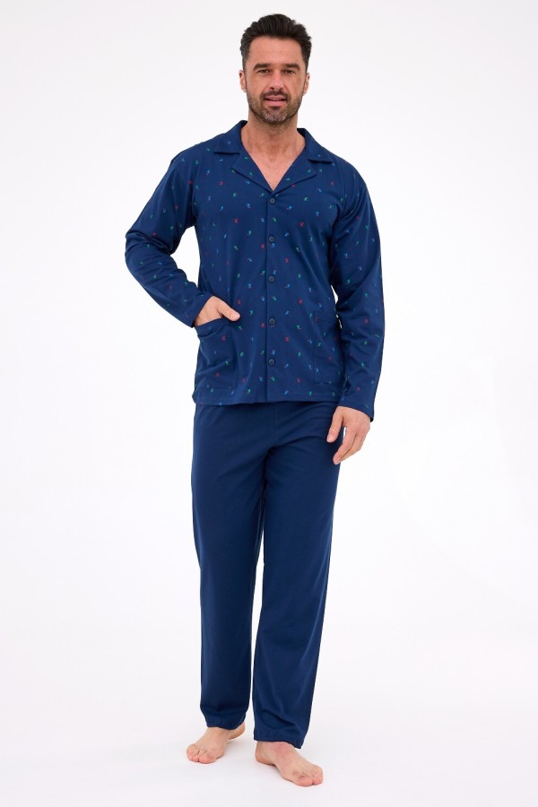Pijama pentru barbati realizata din bumbac de inalta calitate, compusa din 2 piese. Bluza are maneca lunga, decolteu in V finisat cu guler, este prevazuta cu doua buzunare la nivelul soldurilor, prezinta model deosebit cu pasari colorate cu ciocul mare si se inchide in fata cu nasturi, iar pantalonul este lung, uni si are talie elastica confortabila.