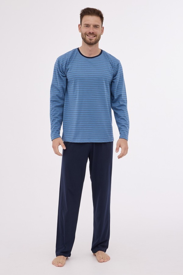 Pijama pentru barbati realizata din bumbac de inalta calitate, compusa din 2 piese. Bluza are maneca lunga, decolteu rotund finisat cu insertie de material in nuanta pantalonului si prezinta model deosebit cu dungi, iar pantalonul este lung, uni.
