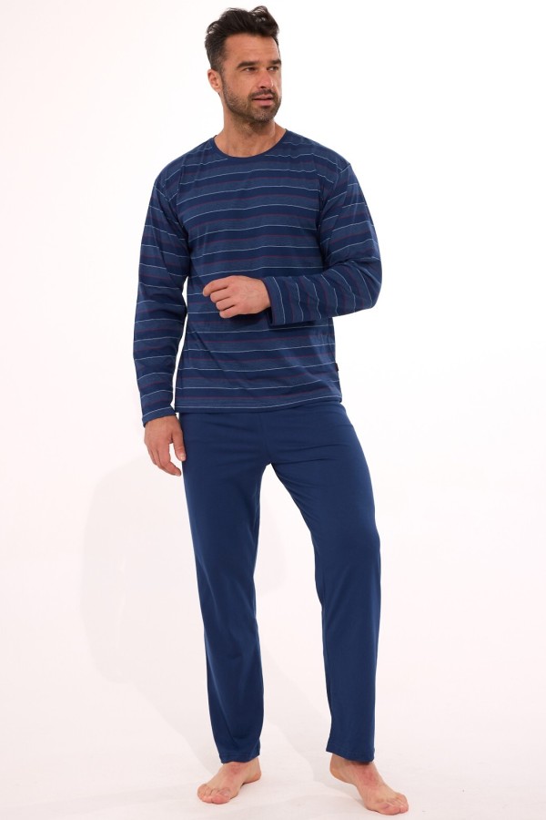 Pijama pentru barbati realizata din bumbac de inalta calitate, compusa din 2 piese. Bluza are maneca lunga, decolteu rotund finisat cu insertie de material in nuanta pantalonului si prezinta model deosebit cu dungi, iar pantalonul este lung, uni.
