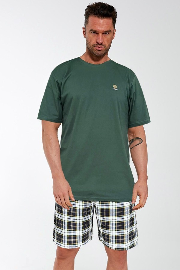 Pijama pentru barbati realizata din bumbac de inalta calitate. Pijamaua este compusa din 2 piese. Bluza are maneca scurta, decolteu rotund si este infrumusetata in zona pieptului cu o broderie subtila, precum si cu inscriptia "Nature", iar pantalonul este scurt, are talie elastica confortabila si prezinta model deosebit cu carouri.
