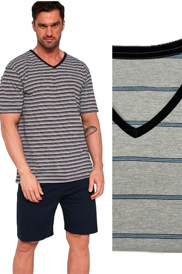 Pijama pentru barbati realizata din bumbac de inalta calitate. Pijamaua este compusa din 2 piese. Bluza are maneca scurta, decolteu in V finisat cu insertie de material in nuanta pantalonului si prezinta model cu dungi colorate, iar pantalonul este scurt, uni si are talie elastica confortabila.