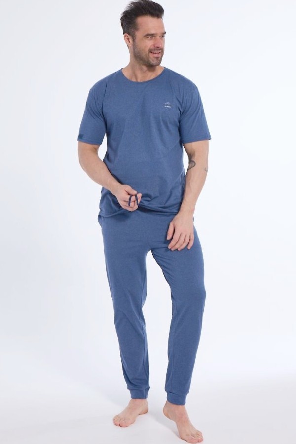 Pijama pentru barbati realizata din bumbac melanj de inalta calitate, compusa din 2 piese. Bluza are maneca scurta, decolteu rotund si este infrumusetata in zona bustului cu un imprimeu mic, iar pantalonul este lung, are talie elastica confortabila a carei circumferinta se poate ajusta cu ajutorul unui siret, este prevazut cu buzunare laterale si finisat in partea inferioara cu mansete.